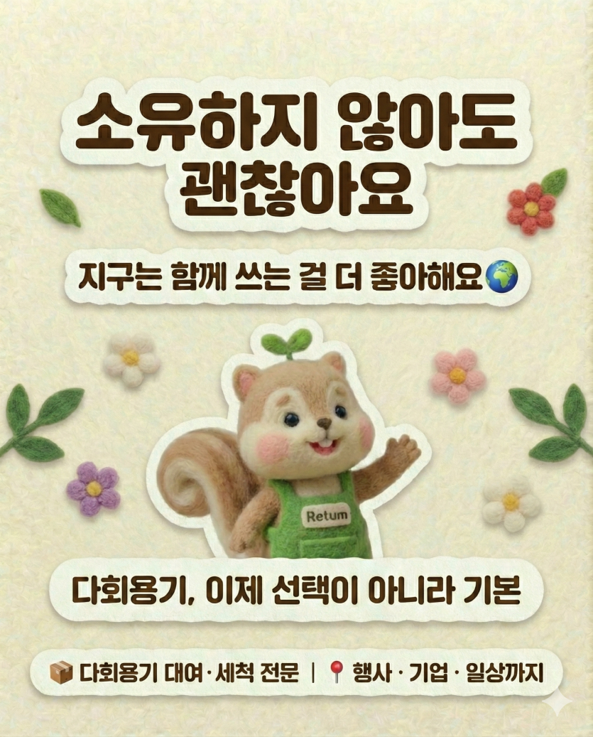 지구는 우리 모두가 잠시 빌려 쓰는 공간입니다. 물건을 소유하지 않아도, 우리는 충분히 편리하고 행복할 수 있습니다. 오히려 지구는 우리가 물건을 함께 나누고 다시 쓰는 '순환'의 모습을 더 좋아한답니다. 이제 다회용기 사용은 선택이 아니라 기본입니다. Retum과 함께 지구를 되돌리는 기분 좋은 변화에 동참해 보세요!