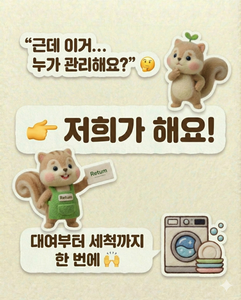 하지만 "다회용기를 직접 챙기고 씻는 게 번거롭지 않을까?"라는 걱정이 드실 수도 있습니다. 그 고민을 해결해 주는 곳이 바로 저희 Retum(리텀)입니다! Retum은 다회용기 대여부터 전문적인 세척 서비스까지 한 번에 관리하여, 여러분이 불편함 없이 순환 소비에 동참할 수 있도록 돕고 있습니다.